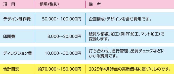以下の表は、一般的な仕様のパンフレットを制作する際の費用目安です。