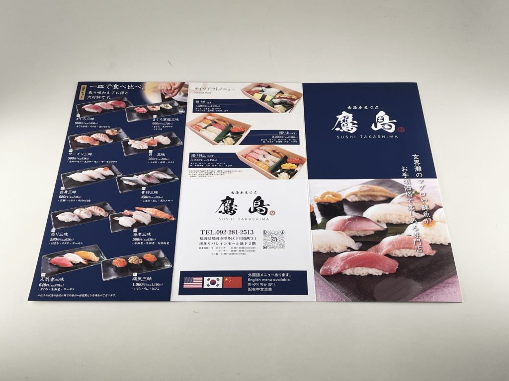 今回は、福岡市博多区にある寿司店「玄海本まぐろ 鷹島」様のリニューアルオープンに際してご依頼いただいた、三つ折りリーフレットの制作事例をご紹介します。集客に繋がるパンフレットやメニューの制作ポイントを知りたい方は、ぜひ最後までご覧ください。