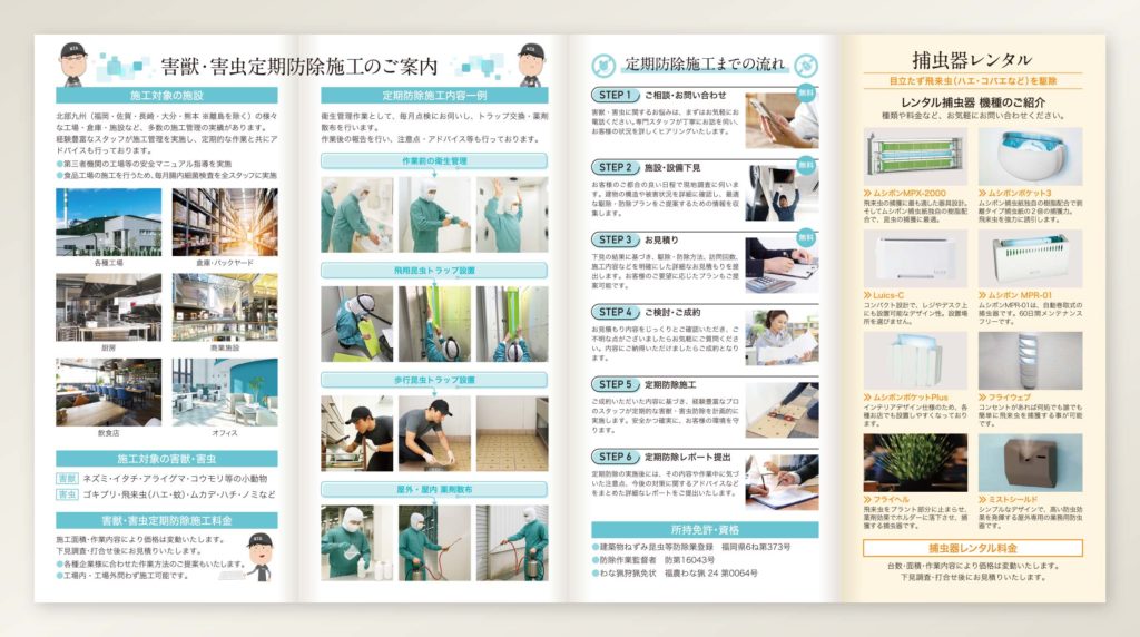 サービス内容の紹介を「害獣・害虫定期防除施工」「サービスの流れ」「捕虫器レンタル」の3つのセクションに分割しました。