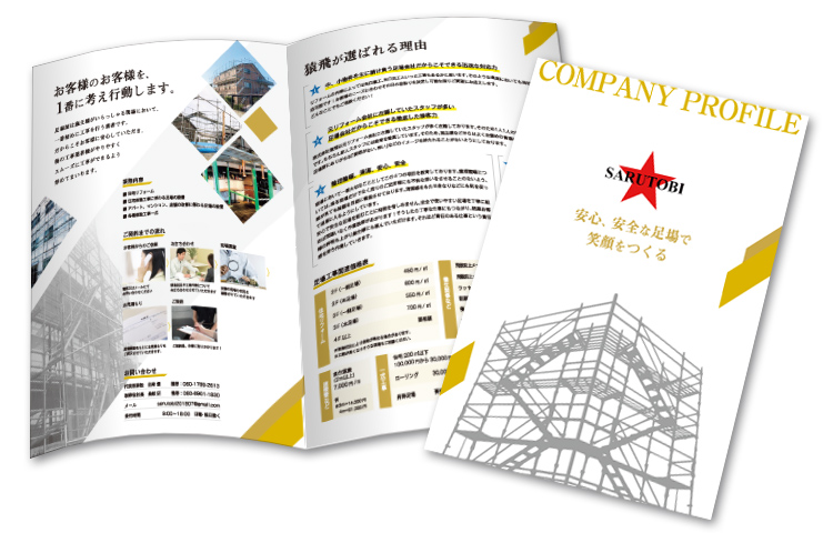 足場を専門とする企業様のため、デザイン全体はカチッとした印象にすることで、業務の正確さとプロフェッショナリズムを強調しています。その一方で、お客様の笑顔や接客の良さを表現するため、アクセントとしてイメージカラーの黄色を効果的に配置しました。これにより、誠実な仕事ぶりだけでなく、親しみやすさも感じられるデザインを目指しています。