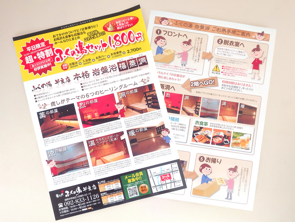 ふくの湯早良店の岩盤浴のご利用手順を、イラストを用いてわかりやすく紹介したフライヤーを制作させていただきました。