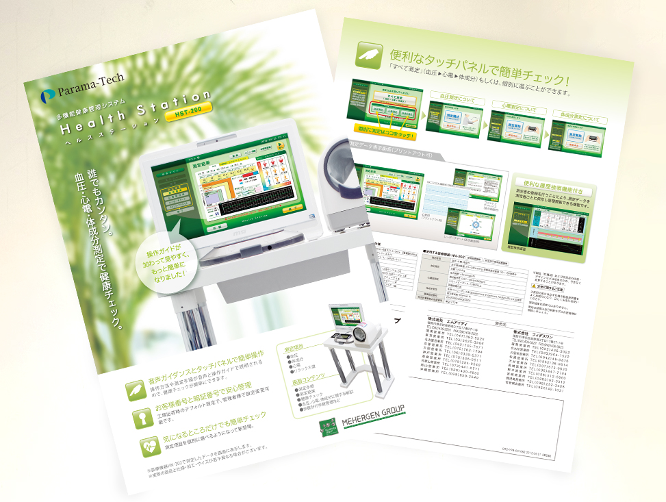 医療機器を扱う株式会社パラマ・テック様より、複数の健康管理機能を持つ「Health Station」を分かりやすく紹介する販促ツールの制作をご依頼いただきました。医療従事者や健康管理に関心のある一般ユーザーに向けて、製品の機能や特長を簡潔に伝えることが求められました。