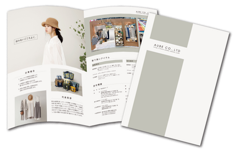 服飾・生活雑貨の製造・卸を行う企業の会社案内です。企業の持つおしゃれでシンプルなイメージを大切にし、コーポレートカラーを用いて全体をすっきりと見やすい紙面に仕上げました。モデルの写真が企業の雰囲気を伝えるのにぴったりだったので、中面のトップにキャッチコピーを添えて配置しました。