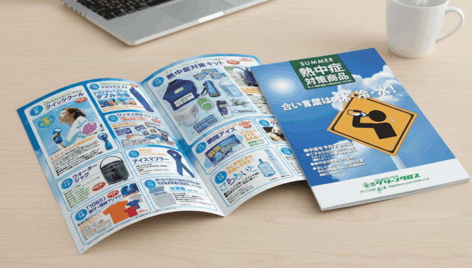 - 緊急性と重要性の伝達: 夏の厳しい環境下で、熱中症対策が不可欠であることをカタログ全体を通じて強く訴求すること。