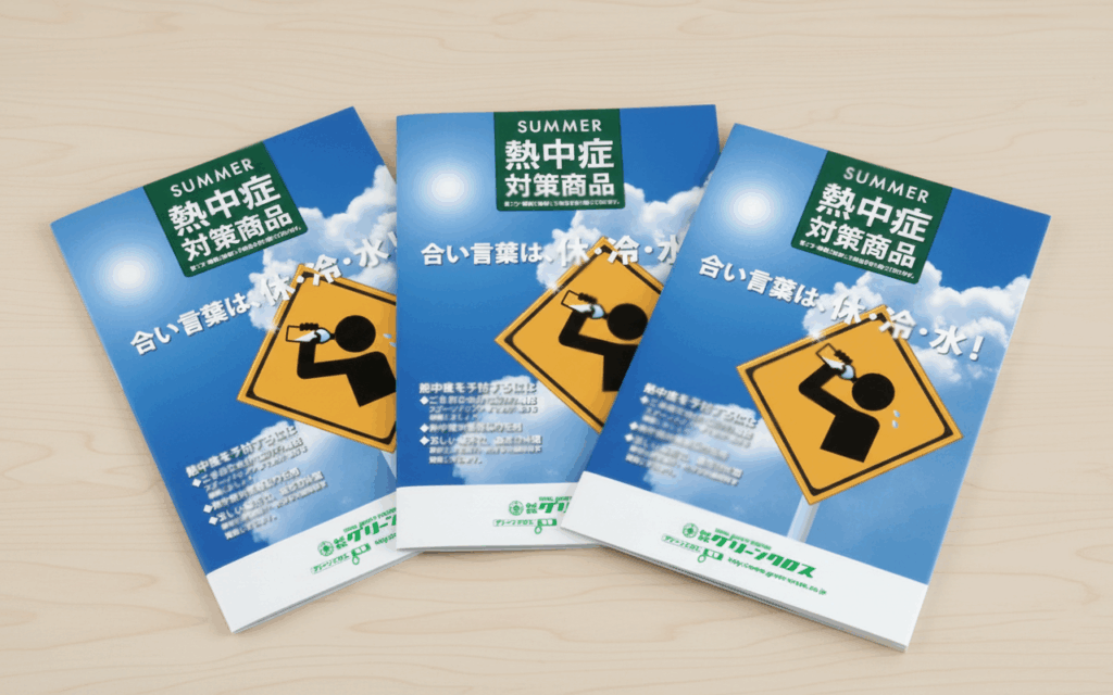 工事用品の販売・レンタルを手掛ける株式会社グリーンクロス様より、熱中症対策商品に特化した特別カタログ制作のご依頼をいただきました。このカタログには、単なる商品紹介だけでなく、社会的責任を果たす企業として、熱中症予防の重要性を訴えかける役割が求められました。制作にあたり、以下の課題を解決する必要がありました。