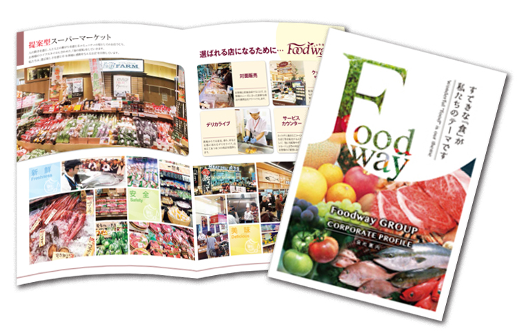 株式会社フードウェイ様の企業案内パンフレットを制作しました。福岡を中心に、東海エリアまでスーパー事業や食肉小売業を展開されている企業です 。今回の制作では、以下の3つのポイントに重点を置いています。