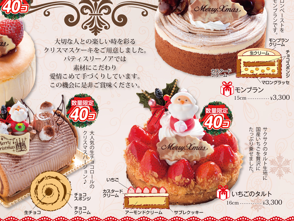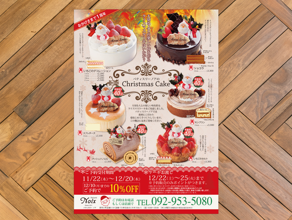 パティスリー ノア「Patisserie Noix」のクリスマスケーキの予約案内フライヤーを作成させていただきました。