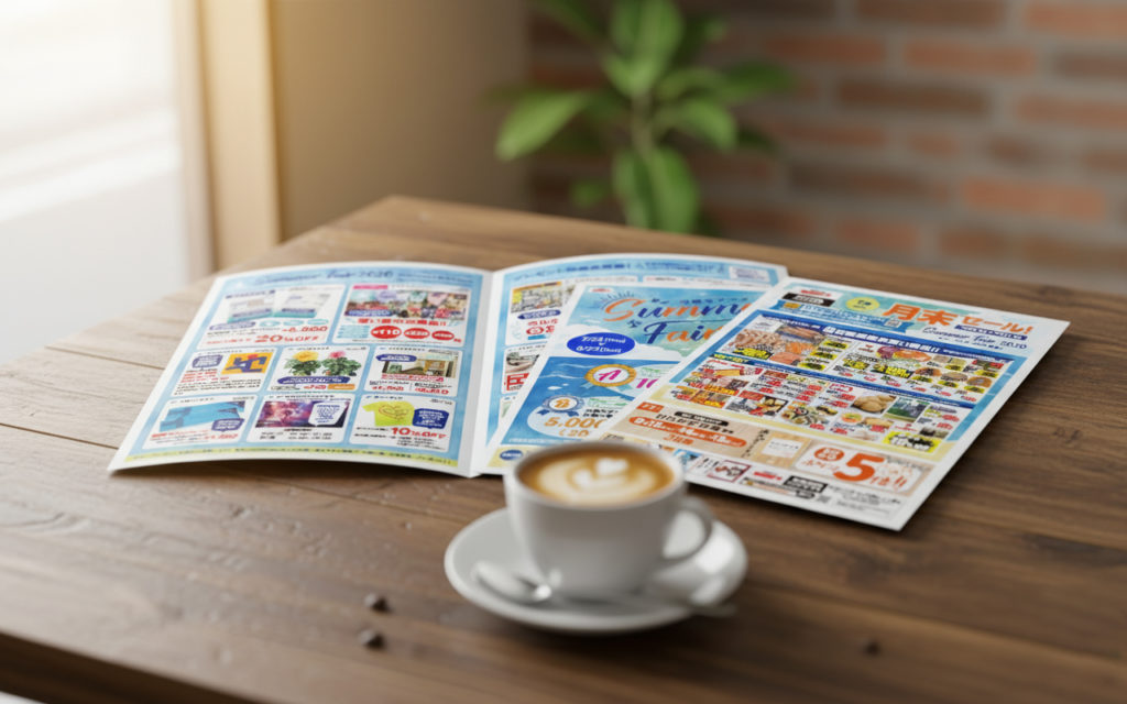 毎月恒例の「月末セール」という緊急性の高い情報と、「サマーフェア」というイベント情報を同時に掲載するため、情報量に対応できる**タブロイド型(B4×8ページ)**を採用しました。これにより、各イベントの詳細を十分なスペースを使って整理し、お客様に混乱なく全ての情報を伝えることが可能となりました。