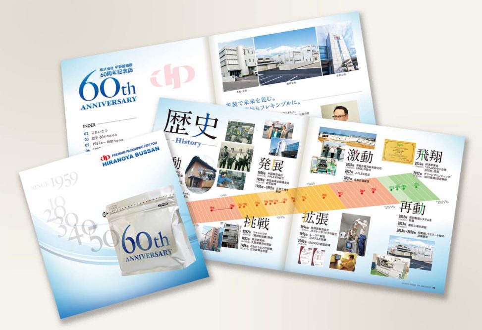 平野屋物産株式会社様の60周年記念誌制作をご依頼いただきました。主な目的は、これまでの会社の歩みを振り返り、同時に未来に向けた明確なビジョンを社内外に伝えることでした。