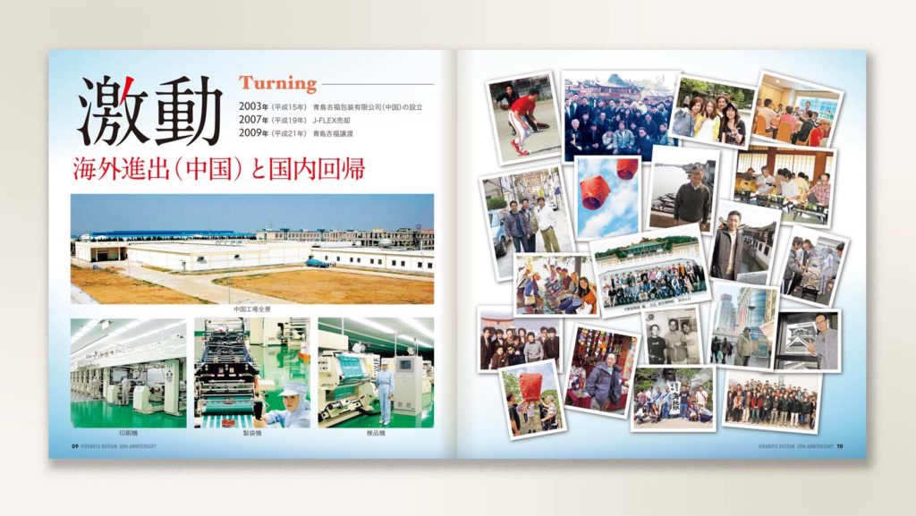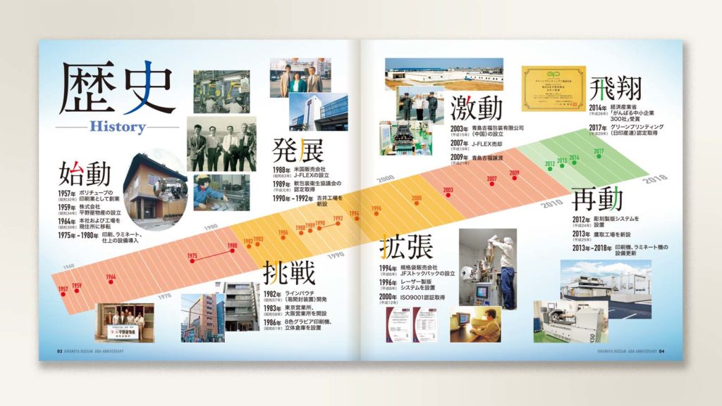 長年の社歴を年代別に写真メインで構成し、視覚的に分かりやすく表現することで、会社の成長と変遷が一目でわかるように工夫しました。